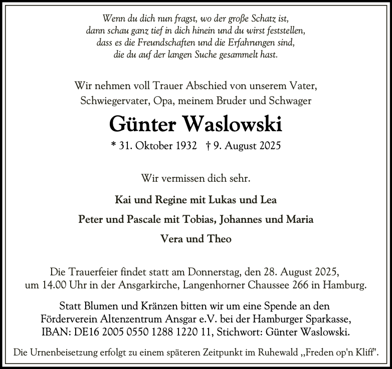 Günter Waslowskigestorben am 9. August 2025