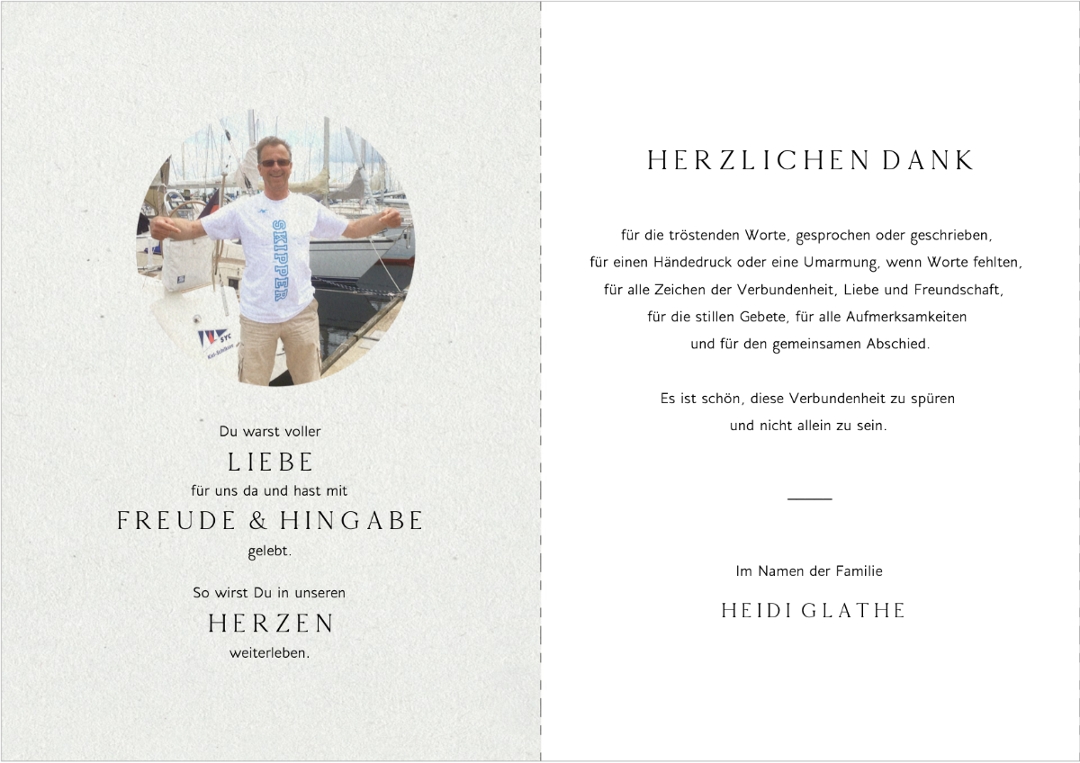 Traurig, aber voller schöner Erinnerungen nehmen wir in Liebe und Dankbarkeit Abschied von meinem Mann, unserem Papa, Schwiegervater und Opa Jens Glathe.